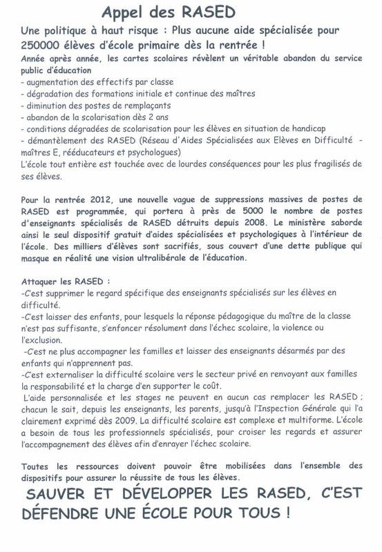 A l'heure des suppressions massives de postes d'enseignants spécialisés entre autres, nous ne pouvons que nous interroger sur ce refus : Mme l'Inspectrice d'Académie s'inquièterait-elle des réactions des parents d'élèves, qui comprendraient de ce fait mieux l'intérêt de la pérennité de ces postes et qui pourraient se mobiliser d'autant plus pour les conserver?